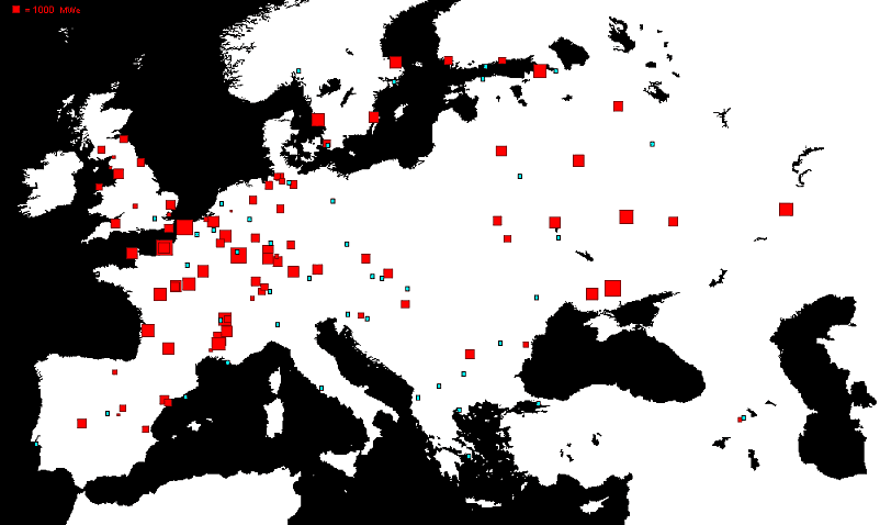 This is a map of European Nuclear Power Plants. The red rectangles represent the NPPs, with areas, proportional to the total MWe power of each one. The green rectangles represent the major European towns.